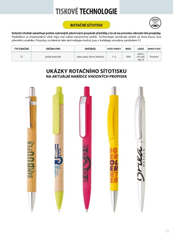 Rotační sítotisk umožňuje potisk vybraných plastových propisek před klip a to až na polovinu obvodu těla propisky.